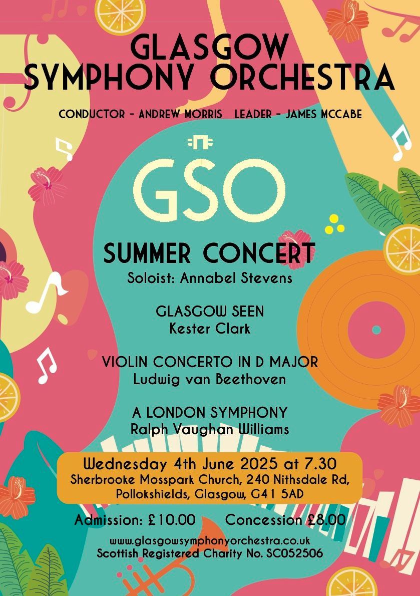The Glasgow Symphony Orchestra is an amateur orchestra established in 1975. Our members range in age from 18 to over 80! We rehearse on a Tuesday evening in the West End and perform three times a year in venues across Glasgow, often joined by soloists. Our repertoire is mostly, but not exclusively, classical, and we perform music by both major composers and those less-well-known. Learn more about us here and enquire about joining here!